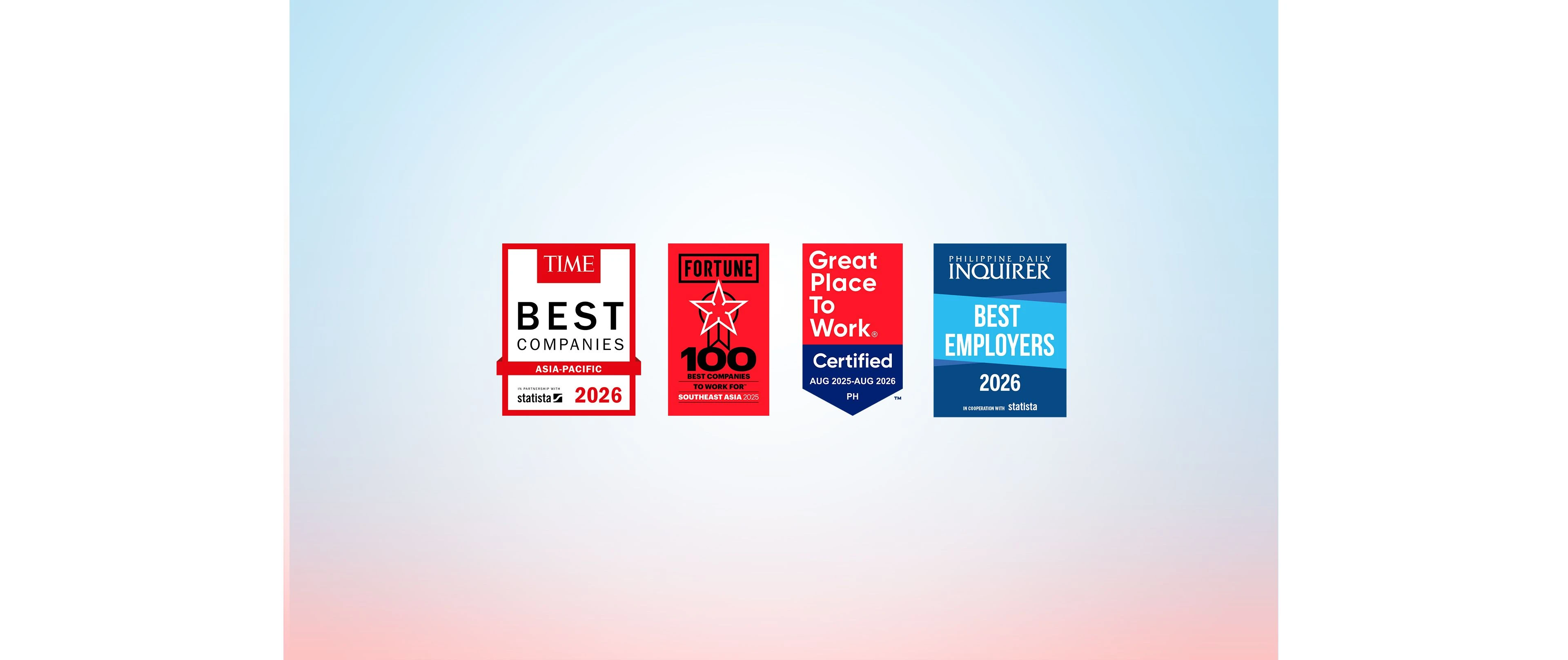 We believe that our team members are the driving force behind our success, so their satisfaction and fulfillment are of utmost importance to us. Being recognized as one of Asia’s Best Companies to Work For and the Philippines’ Best Employers is testament to our commitment to our employees.