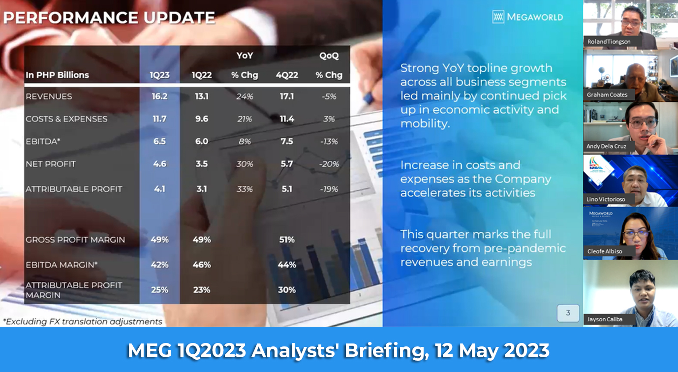 | May 12, 2023 | MEG 1Q2023 Briefing | Virtual | Megaworld Corporation | Analyst Briefing |